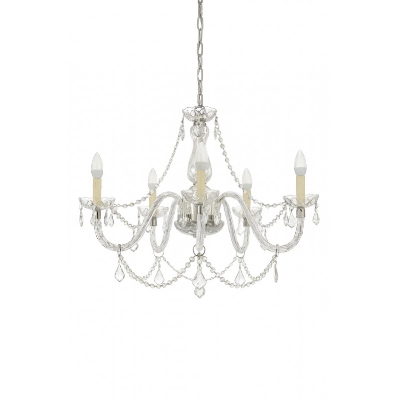 Αναδείξτε την κομψότητα και τη διαχρονική φινέτσα του χώρου σας με αυτόν τον εντυπωσιακό κρυστάλλινο πολυέλαιο. Με έξι σημεία φωτισμού σε μορφή κηροπήγιου, το φωτιστικό συνδυάζει την κλασική αισθητική με τη λάμψη των πολυτελών υλικών.