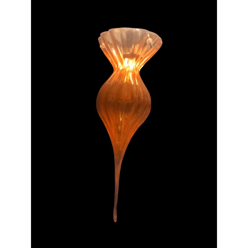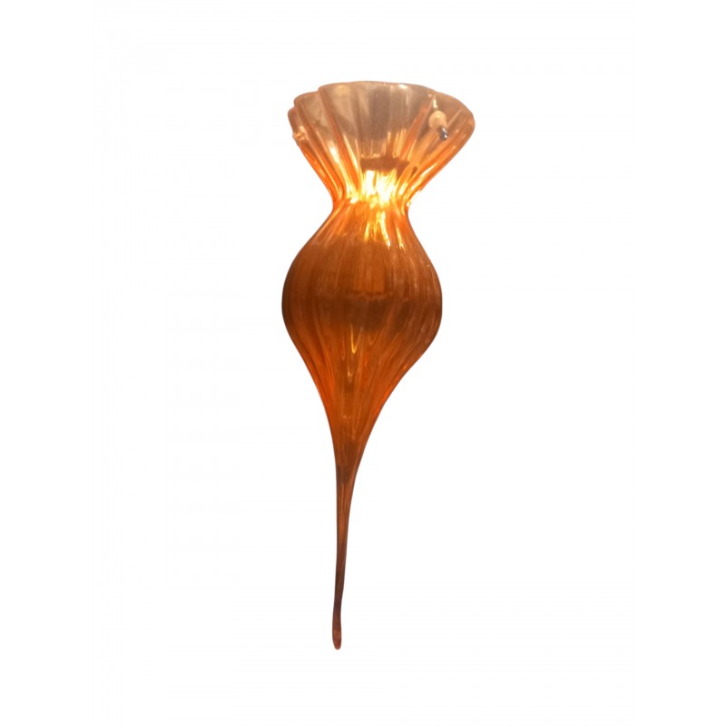 Αναβαθμίστε τη διακόσμηση του χώρου σας με αυτό το μοναδικό, χειροποίητο φωτιστικό τοίχου, φτιαγμένο με την παραδοσιακή τεχνική του φυσητού γυαλιού. Η εκλεπτυσμένη, ρευστή του φόρμα και η εντυπωσιακή του απόχρωση σε κεχριμπάρι, δημιουργούν ένα παιχνίδι φωτός και σκιάς που προσθέτει ζεστασιά και πολυτέλεια σε κάθε δωμάτιο.